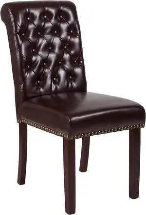 HERCULES Series Brown Leather Parsons Chair with Rolled Back, Accent Nail Trim and Walnut Finish