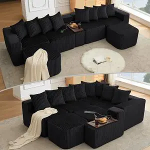 [NEW ARRIVED] [VIDEO PROVIDED] 137.5" U Shaped Sofa , USB & Wireless Charge, Coffee Table Board With a Cup Holder, Oversize Movable Modular Sofa,Movable Footstool,No Assembly,6 Seats,Corduroy,Black- Finish: Black