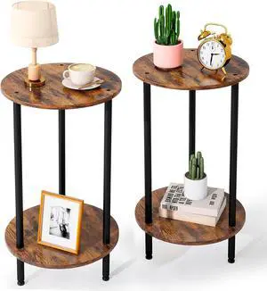 2 Tier Coffee Table in Living Room, Industrial Style Round End Table with Metal Tray, Small Outdoor Side Table for Bedroom Balcony Patio, Rustic Brown