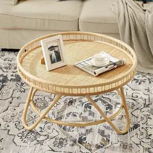 FINECASA Round Rattan Coffee Table, 32'' Wicker Boho Hand-Woven Top, Modern Unique Farmhouse Tray Top Center Table for Living Room Apartment Small Space, Natural Rattan