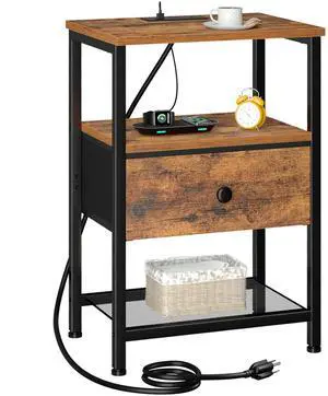 Night Stand with Charging Station, Small Bedside Table with Fabric Drawer, Nightstand with USB Ports & Outlets for Bedroom, Brown, HETS010BR-1