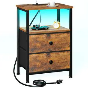 Night Stand with Charging Station, Small Bedside Table with USB Ports & Outlets, LED Nightstand with 2 Fabric Storage Drawers PU Finish for Bedroom, Brown, HETS02BR-1