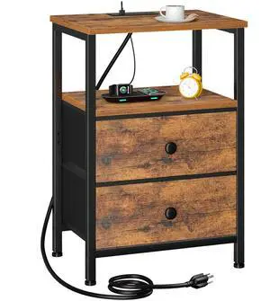 Night Stand with Charging Station, Small Bedside Table with 2 Fabric Drawers, Nightstand with USB Ports & Outlets for Bedroom, Brown, HETS020BR-1