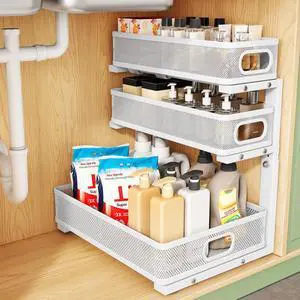 Kitstorack Under Sink Organizer, 1-Pack 3-Tier Height Adjustable Thickened Metal Pull out Cabinet Organizer Shelf, Slide out Storage Drawer Rack for Bathroom Kitchen Pantry Home Laundry Organization