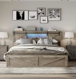 Farmhouse Bed Frame King Size with LED Lights and Charging Station, Wooden Queen Bed with 2 Storage Drawers, Rustic Headboard with Sliding Barn Door Storage Cabinets