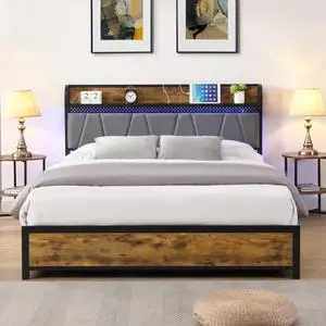 Queen Size Bed Frame, Storage Headboard with Charging Station and 4 Storage Drawers,LED Lights , Brown and Gray