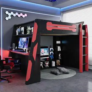 Full-Size Gaming Bunk Bed with Side-Mounted Oversized RGB Desk, USB Charging Ports & Cable Grommet, LED Light Strip, Heavy-Duty Esports Loft Frame Cool Design-Red