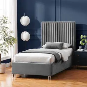 Inspired Home Matix Platform Bed - upholstered, deep channel tufted design | clear acrylic legs, Grey Velvet