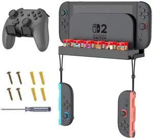Wall Mount for Nintendo Switch 2, Metal Wall Mount Kit with 1 Controller Holder, 12 Game Card Holders, 2 Joy-Con Hooks, Space-Saving Console Organizer Behind TV, Black