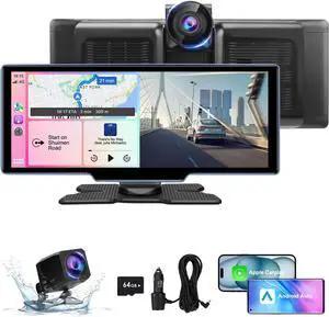 Wireless Carplay Screen for Car 1080p Backup Camera, 10.26" Portable Car Play & Android Auto Touch Screen with 4K Dash Cam, Mirror Link, Bluetooth, Voice Control, GPS Navigation, for All Cars