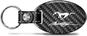 Ford Mustang Script Real Carbon Fiber Oval Shape Black Leather Strap Key Chain