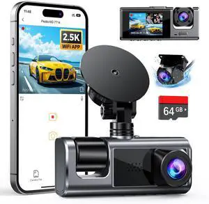 3 Channel WiFi Dash Cam Front and Rear Inside with 64GB SD Card, 2.5K+1080P+1080P Car Dash Camera for Cars Front and Rear, Dashcam with G-Sensor, Loop Recording, 24H Parking Mode, Support 512GB