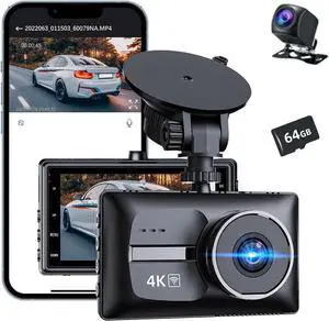 4K Car Cameras Dash Cam Front and Rear, 4K+1080P Dual Dash Camera for Cars with 64GB Card, 170°Wide Angle Mini Car Camera, 3 IPS Screen, WDR Night Vision, G-Sensor, Parking Mode