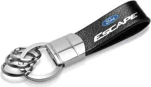 Ford Escape Black Real Leather Strap Chrome Round Hook Metal Key Chain