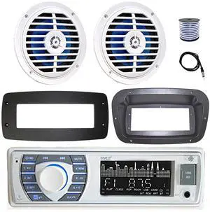 Pyle PLRMR23BTW Single DIN Bluetooth Marine MP3 Stereo Receiver, Spa bezel, Adapter Plate, 22" Radio Antenna, Wire, 2x 6.5" 250 Watt Max 2-Way Waterproof Multicolor LED Audio Speakers (White)
