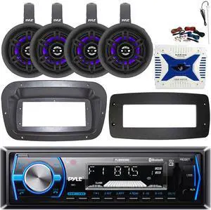 Pyle PLMRB29B Single-DIN Marine Bluetooth USB/AUX MP3 AM/FM In-Dash Stereo Black Receiver W/Install Kit + Adapter Plate, 4x 4" 300W Max Wakeboard LED Tower Speakers, 4 Channel Amplifier W/Kit, Antenna