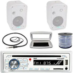 Pyle PLCDBT65 Single-DIN Marine Bluetooth USB/AUX CD Player AM/FM Stereo Receiver W/White Cover, 2x 3.5" 300W Max Power Indoor/Outdoor White Waterproof Speakers W/50 Feet 18G Wire, 22" Radio Antenna