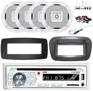 Pyle PLCDBT65 Single DIN Bluetooth Marine CD Stereo Receiver, Spa bezel, Adapter Plate, 22" Radio Antenna, Wire, 4x 4" 30 Watt Peak Water-Resistant 3-Way InDoor/OutDoor Audio Speakers (White)