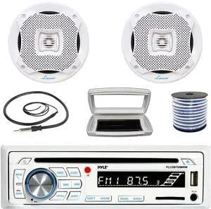 Pyle PLCDBT65 Single DIN Bluetooth Marine CD Stereo Receiver, Spa bezel, Adapter Plate, 22" Radio Antenna, Wire, 2x 4" 30 Watt Peak Water-Resistant 3-Way InDoor/OutDoor Audio Speakers (White)