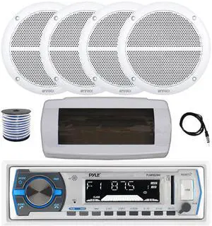 Pyle PLMRB29W Single DIN Bluetooth Marine MP3 AM/FM Stereo Receiver with White Cover, 22" Radio Antenna, Wire, 4x 4" 30 Watt Peak Water-Resistant 3-Way InDoor/OutDoor Audio Speakers (White)