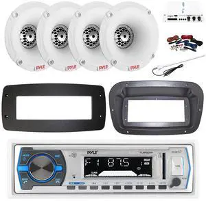 Pyle PLRMR23BTW Single DIN Bluetooth Marine MP3 Stereo Receiver, Spa bezel, Adapter Plate, 22" Radio Antenna, Wire, 4x 6.5" 450 Watt Peak 2-Way Water Resistant Boat Audio Speakers (White)
