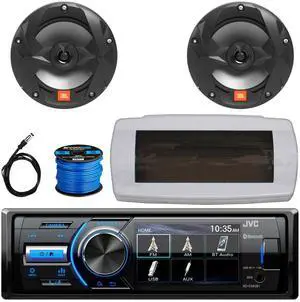 JVC KD-X560BT Single-DIN Marine Bluetooth USB/AUX MP3 AM/FM Radio Digital Media Stereo Receiver W/White Cover, 2x 6.5" 225W Max Power 2-Way Multi-Element Black Boat Speakers W/50 Feet Wire, Antenna
