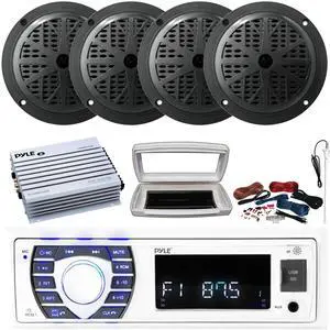 Pyle PLRMR23BTW Single-DIN Bluetooth Marine USB/AUX MP3/SD AM/FM Radio Stereo Receiver W/White Cover, 4x 5.25" 180W Max Power 2-Way Low Profile Boat Black Speakers, 4 Channel Amplifier W/Kit, Antenna