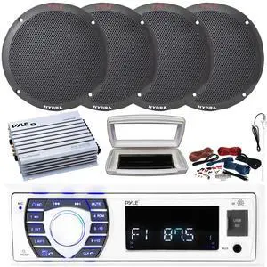 Pyle PLRMR23BTW Single-DIN Bluetooth Marine USB/AUX MP3/SD AM/FM Radio Stereo Receiver W/White Cover, 4x 5.25'' 100W Max Power 2-Way Full Range Black Speakers, 4 Channel Amplifier W/Kit, Radio Antenna