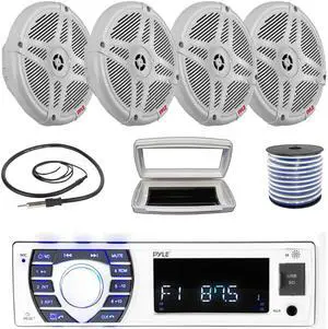 Pyle PLRMR23BTW Single-DIN Bluetooth Marine USB/AUX MP3/SD AM/FM Radio Stereo Receiver W/White Cover, 4x 6.5'' 400W Max Power Dual Cone 2-way Full Range Speakers, 4 Channel Amplifier, Radio Antenna