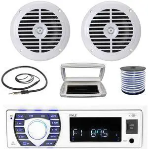 Pyle PLRMR23BTW Single-DIN Bluetooth Marine USB/AUX MP3/SD AM/FM Radio Stereo Receiver W/White Cover, 4x Pyle PLMR22WT 2.25' 10 Watt Max Power Full Range Off-Road White Speakers W/Wire, Radio Antenna