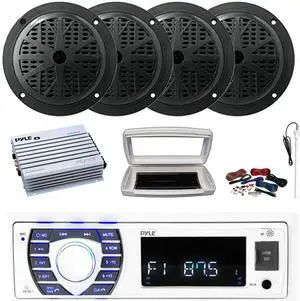 Pyle PLRMR23BTW Single-DIN Bluetooth Marine USB/AUX MP3/SD AM/FM Radio Stereo Receiver W/White Cover, 4x 6.5'' 120W Max Power Dual Cone Boat Audio Black Speakers, 4 Channel Amplifier W/Kit, Antenna