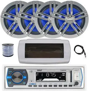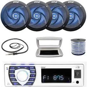 Pyle PLRMR23BTW Single-DIN Bluetooth Marine USB/AUX MP3/SD AM/FM Radio Stereo Receiver W/White Cover, 4x 4" 100W Max Power Waterproof Low-Profile Slim Style Blue LED Speakers W/50 Feet Wire, Antenna