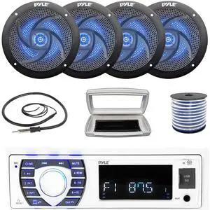 Pyle PLMRB29W Single DIN Bluetooth Marine MP3 AM/FM Stereo Receiver with White Cover, 22" Radio Antenna, Wire, 4x 6.5" 180 Watt Max Power 2-Way Water Resistant Audio Speakers (Charcoal)