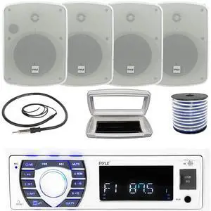 Pyle PLRMR23BTW Single-DIN Bluetooth Marine USB/AUX MP3/SD AM/FM Radio Stereo Receiver W/White Cover, 4x Pyle PLMR51B 5.25'' 100 Watt Max Power 2-Way Full Range Black Speakers W/50 Feet Wire, Antenna