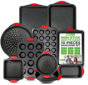 NutriChef Premium 10-Piece Bakeware Set - Flexible Nonstick Carbon Steel, Stylish Red Silicone Handles, Oven Safe Up to 450°F, Dishwasher Safe, Ideal for Baking Cakes, Muffins & More