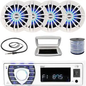 Pyle PLMRB29W Single DIN Bluetooth Marine MP3 AM/FM Stereo Receiver with White Cover, 22" Radio Antenna, Wire, 4x 6.5" 120 Watt Peak Multicolor LED Boat Audio Speakers w/Chrome Grilles (Black)