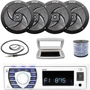 Pyle PLMRB29W Single DIN Bluetooth Marine MP3 AM/FM Stereo Receiver with White Cover, 22" Radio Antenna, Wire, 4x 6.5" 180 Watt Max Power 2-Way Water Resistant Audio Speakers (Charcoal)