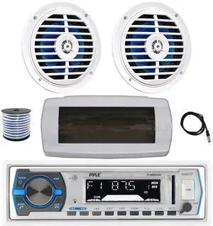 Pyle PLMRB29W Single DIN Bluetooth Marine MP3 AM/FM Stereo Receiver with White Cover, 22" Radio Antenna, Wire, 4x 5.25'' 100 Watt Peak Full Range Dual Cone Waterproof Stereo Speakers (White)