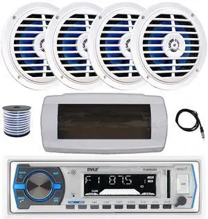 Pyle PLMRB29W Single DIN Bluetooth Marine MP3 AM/FM Stereo Receiver with White Cover, 22" Radio Antenna, Wire, 4x 6.5" 120 Watt Peak Full Range Dual Cone Waterproof Stereo Speakers (White)