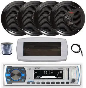 Pyle PLMRB29W Single DIN Bluetooth Marine MP3 AM/FM Stereo Receiver with White Cover, 22" Radio Antenna, Wire, 4x 6.5" 120 Watt Peak Full Range Dual Cone Waterproof Stereo Speakers (Black)