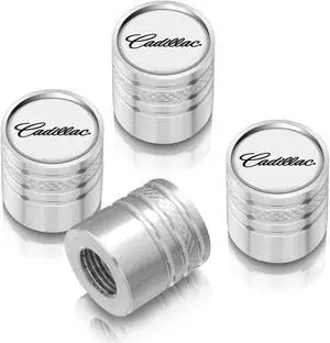 Cadillac Script Nameplate in White on Shining Silver Aluminum Cylinder-Style Tire Valve Stem Caps