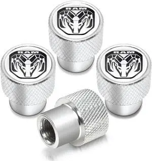 RAM in White on Shining Silver Aluminum Cylinder-Style Tire Valve Stem Caps