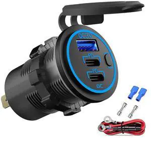 12V USB Outlet Wire USB Charger Multi Port, Dual PD3.0 USB-C and Quick Charge3.0 Car Port Socket with Power Switch, Fast Charge for Phone lPad Android Phones, Suitable for Car Boat RV Marine ATV
