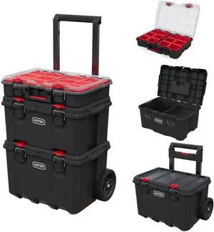Keter Stack N Roll 3-Piece Rolling Tool Box System Stackable Modular Tool Organizer with Wheels, Clear Lid Small Parts Storage & Locking Latches for Garage, Workshop & DIY