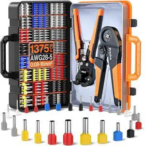 Preciva Ferrule Crimping Tool Kit - AWG 28-5 Hexagonal Ferrule Crimper with Automatic Wire Stripper and 1375Pcs Single/Twin Ferrule Connectors, Self-Adjustable Ratchet Ferrule Terminals Crimping Tool