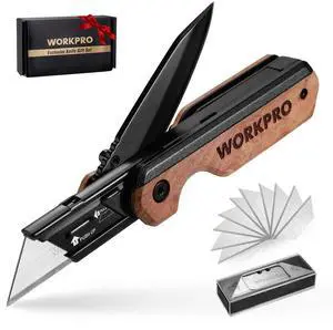 Folding Utility Knife with Stainless Steel Head, Quick-change Blade & Back Lock, Wood Handle Heavy Duty Box Cutter, 1PC Razor Knife with Extra 10PC SK5 Blades