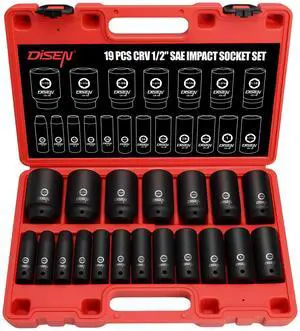 19 Pcs 1/2" SAE Impact Socket Set, Deep Sockets 3/8"- 1-1/2", 6-Point Cr-V & Alloy Steel, 1/2 Inches Drive Impact Socket Set,Rugged Construction, Enhanced Storage Case