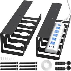 2 Pack Metal Under Desk Cable Management Tray, U Channel Cord Organizer Box, Office Under Desk Cord Organizers, Cable Management with Various Accessories, Black, 15.75 Inches