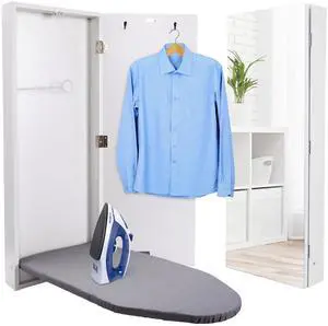 Ivation Wall-Mounted Ironing Board Cabinet With Mirror, Foldable Ironing Storage Station for Home, Apartment , Easy-Release Lever, Garment Hooks, White