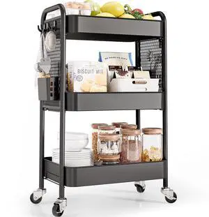 3 Tier Rolling Cart Storage Organizer, Metal Rolling Utility Car with Wheels, Hooks & Bins Esthetician Art Sturdy Storage with Pegboard for Bathroom, Kitchen, Office, Nursery Diaper